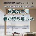 2026年2月12日 / 最終更新日時 : 2026年2月22日 tama PODCAST 132 日本の二月:春が待ち遠しい|February in Japan: Waiting for Spring|日本的二月:期待春天的到來 みなさん、こんにちは。「てくてく日本語」日本語教師のたまです。この番組は、日本語を勉強している人のためのポッドキャストです。日本の生活や文化、日本語のことについて、できるだけわかりやすい日本語でお話します。 ****** […]